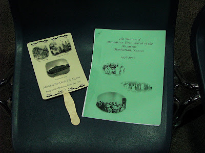 We designed a fan that highlighted the three buildings that had housed our congregation since 1938, and I put together this green booklet about our local church history.  It was told in story form. Some pastors had written in and told some memories that were added to the story. Believe it or not, our first pastor is still alive.  He is 94 years old and was pastor for one year--1936.  There were 4 pages of pictures in the back of the booklet.
